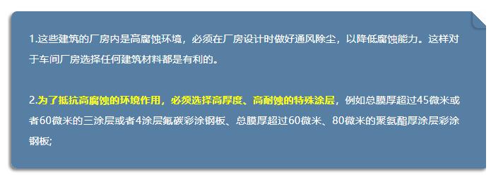 行業(yè)特點(diǎn):化工產(chǎn)品具有揮發(fā)性特點(diǎn),容易產(chǎn)生酸性或堿性等腐蝕性較大的揮發(fā)性物質(zhì),遇水后容易形成露珠附著在彩板表面,對彩板的涂層產(chǎn)生腐蝕,并有可能進(jìn)一步腐蝕到鋅層甚至鋼板。