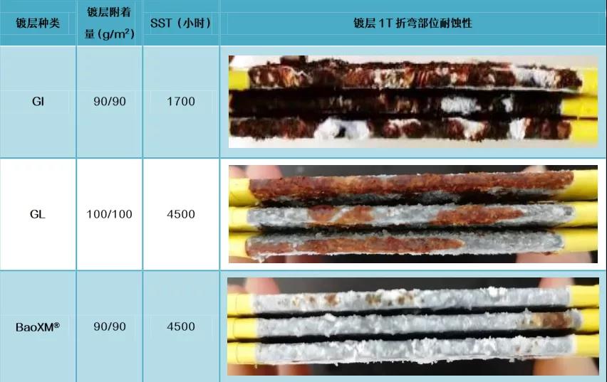 根據戶外掛片結果,BaoXM®鍍層在典型海洋氣候、酸雨氣候均表現出較熱鍍鋅、鍍鋁鋅更強的環境耐蝕性。