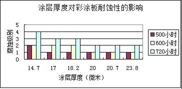 從微觀上講、涂層是多空的組織。空氣中的水、腐蝕介質(zhì)(氯離子等)就會通過涂層的薄弱部分侵入,造成膜下腐蝕,進(jìn)而涂層起泡并剝落。另外,即使同樣涂層厚度,二次涂層要比一次涂層致密。根據(jù)國外報道和相關(guān)腐蝕試驗(yàn)結(jié)果,正面涂層20μm以上才能有效的防止腐蝕介質(zhì)的侵入,由于底漆和面漆的防腐蝕機(jī)理不同,不僅要規(guī)定總膜厚,還有分別要求底漆(》5μm)和面漆(》15μm)的厚度,只有這樣,才能保證彩涂鋼板不同部位的耐蝕性是均衡的。